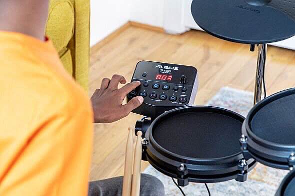 Al centro del Turbo Mesh Kit si trova il ricco modulo elettronico Turbo. Il modulo Turbo offre 10 nuovi preset di kit, con sonorità classiche e moderne, progettati su misura da Alesis. Questi kit includono 120 suoni di batteria individuali e utilizzano la tecnologia Intelligent Dynamic Articulation™ per garantire un suono e una suonabilità incredibilmente realistici.